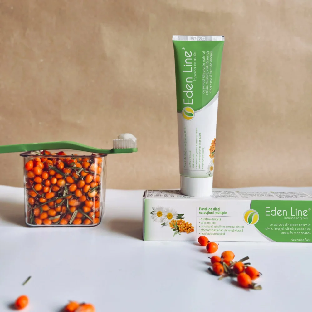 Majoritatea pastelor de dinți folosesc fluor și substanțe chimice agresive pentru a proteja smalțul și pentru a reda albul natural. Pasta de dinți Eden Line merge mai departe și oferă o formulă inovatoare, bazată pe ingrediente naturale și pe hidroxiapatită – mineralul care se regăsește în mod natural în structura dintelui.